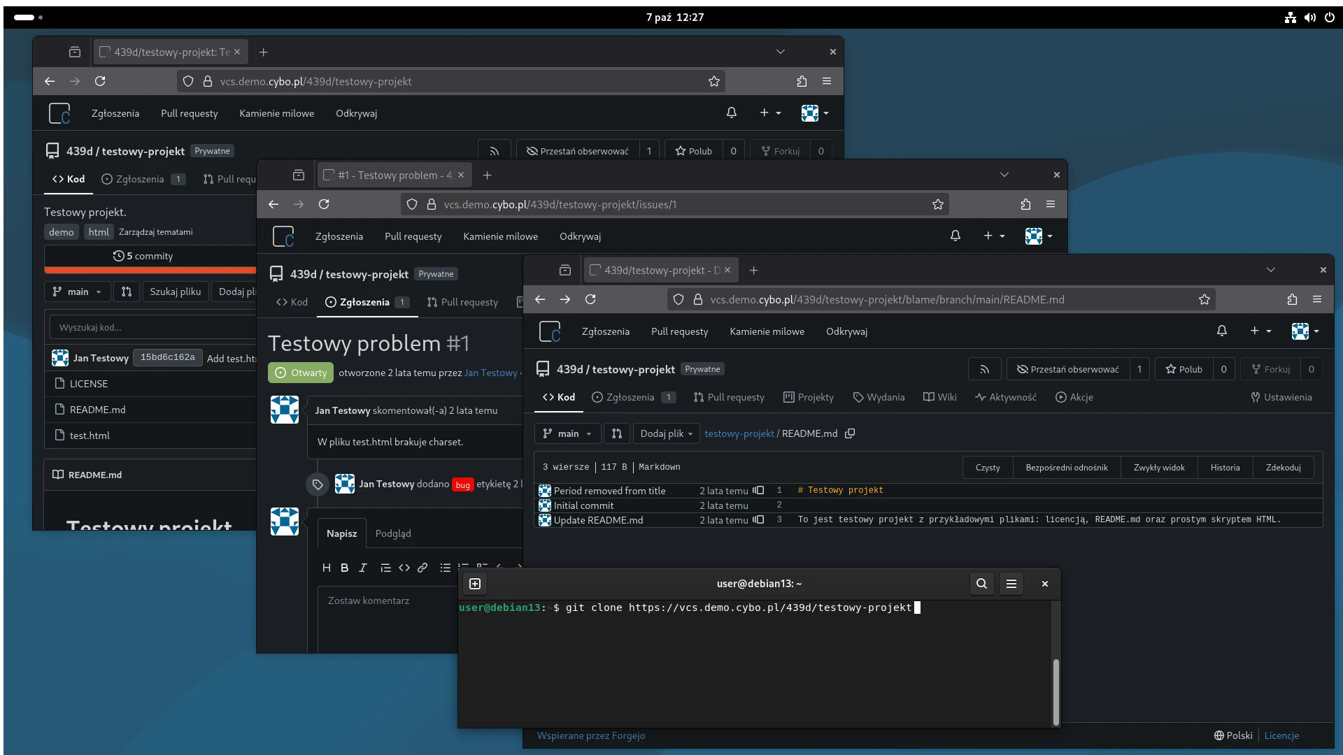 Sprawne zarządzanie zmianami kodu oprogramowania i konfiguracji systemów w dzisiejszym świecie wiąże się z ograniczeniem do minimum robótek ręcznych na rzecz automatyzacji. W tym celu wymyślono m.in. systemy do kontroli wersji zawierające narzędzia tj. git i obsługę procesów ciągłej integracji i ciągłego dostarczania (CI/CD) uzbrojone w wygodne interfejsy webowe, pozwalające na współpracę wielu użytkowników w uporządkowany sposób (np. zgłaszanie błędów, zmian w kodzie, analizę całej historii zmian, automatyzację testów i generowania wyników). Aplikacja VCS w cybo.pl pozwala na wygodne zarządzanie repozytoriami git, w tym obsługę issues, pull requestów oraz automatyzację CI/CD.
